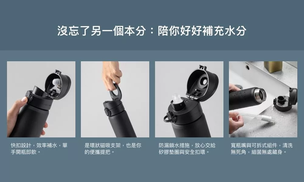 A:若有水漬,不鏽鋼瓶身可放入適量白醋或食用小蘇打、Tritan 瓶身則可使用中性清潔劑,皆以溫水稀釋後用柔軟的布將污垢清洗乾淨,用水沖洗乾淨後擦乾或陰乾即可,請避免請勿用硬物刮擦水垢或鏽斑,以免破壞杯壁。