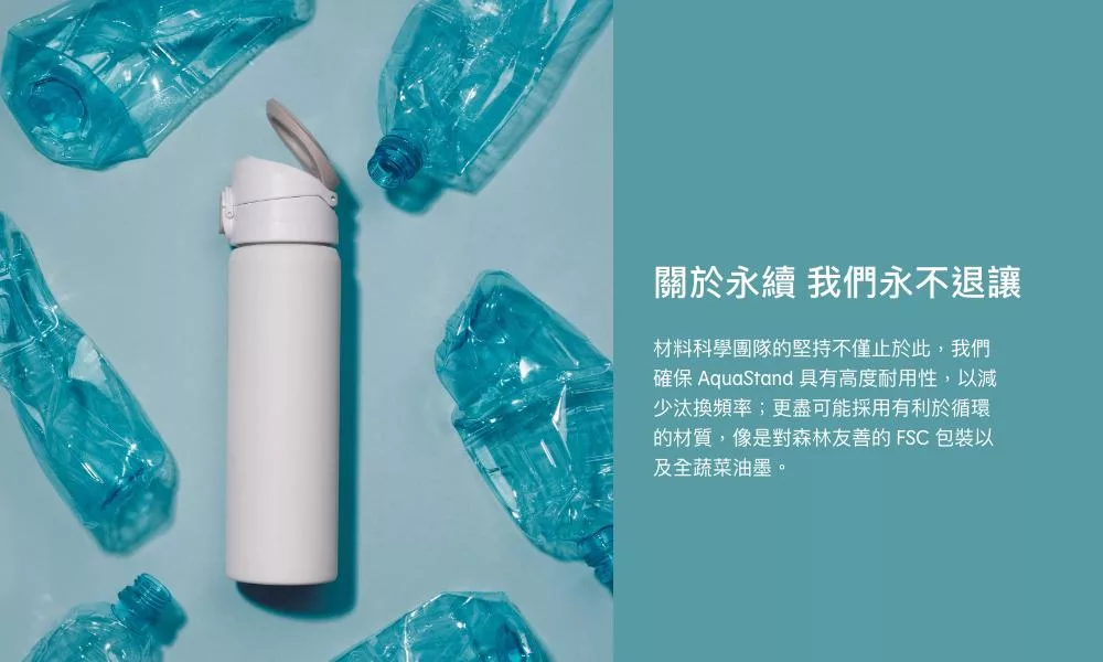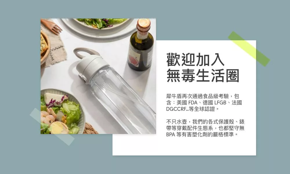 A:犀牛盾 AquaStand 通過美國 FDA、德國 LFGB 、法國 DGCCRF 認證,不含雙酚 A/ F/ S 等塑料常用的化學物質。
