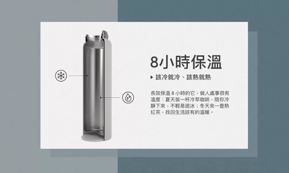 A:犀牛盾 AquaStand 磁吸水壺不銹鋼材質,採真空雙層構造實現高保溫和保冷效力。經過8小時,熱飲還維持溫熱口感,冷飲保持冰涼,長時間保持飲品溫度。此外,也不會有瓶身外結露或瓶身過燙無法拿取與攜帶的狀況。