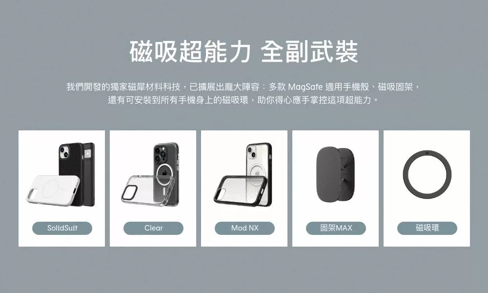 A:犀牛盾 AquaStand 磁吸水壺可搭配犀牛盾 MagSafe 兼容手機殼、Apple 原廠以及大部分第三方推出的 MagSafe 兼容保護殼使用。不過因市面上的廠牌眾多、各廠牌的磁吸力可能有所不同,仍需以實際搭配結果為主。