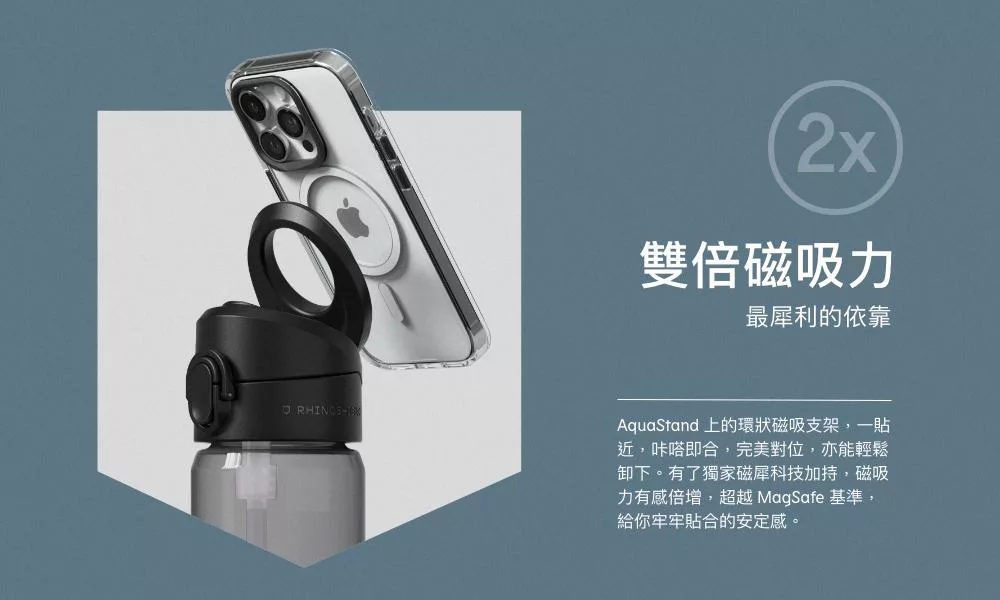 A:如果你使用的手機是 iPhone 12 或更高階版本其支援 MagSafe 技術,你可以直接透過磁力將 iPhone 快速固定或移除於 AquaStand 磁吸水壺上,同時我們建議您搭配犀牛盾 MagSafe 兼容手機殼,以達最佳磁吸效果。