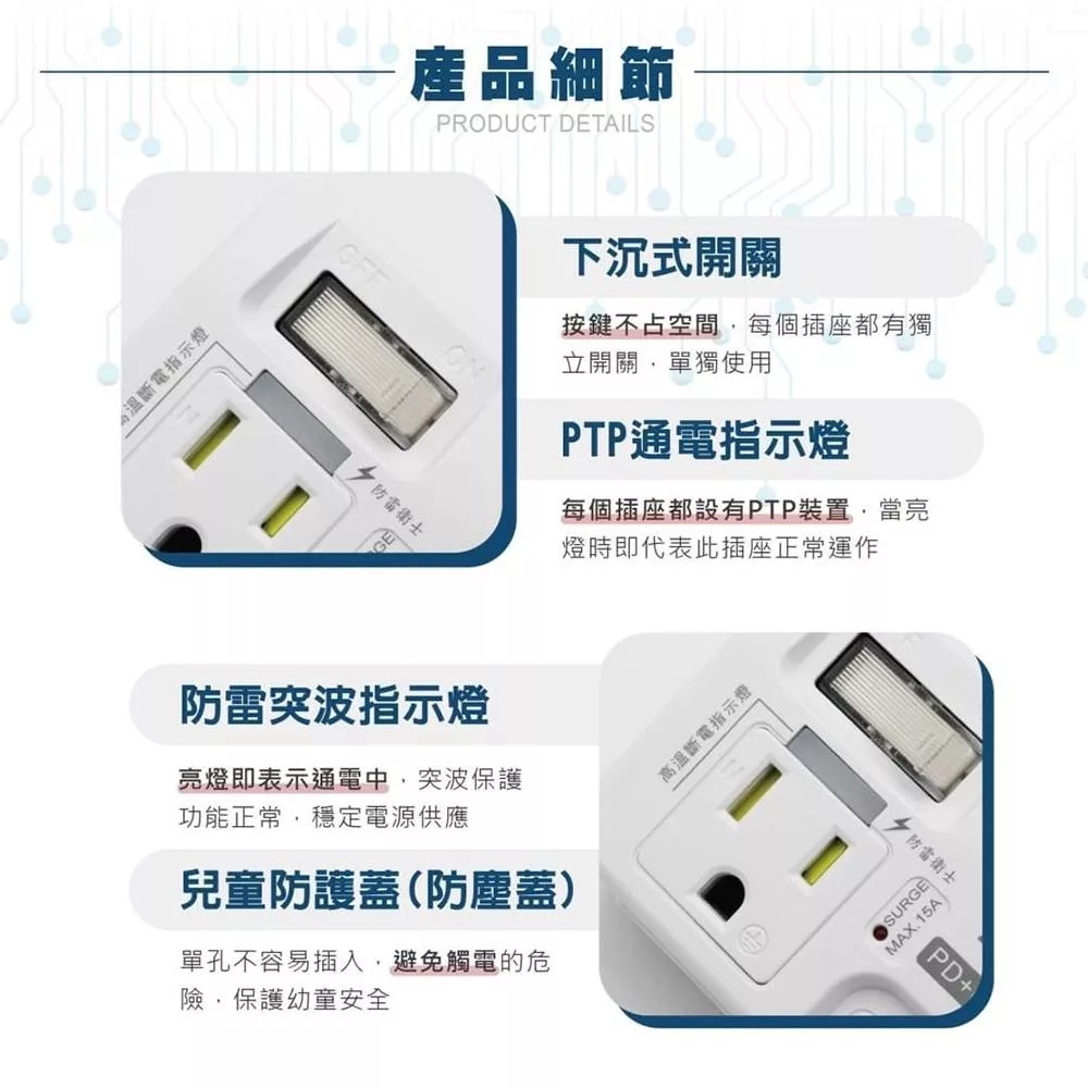 群加 PowerSync 2P+3P 1開2插防雷擊節能壁插(TWTM12SN)