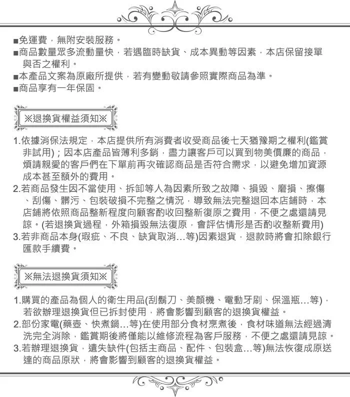 6.涉及個人衛生,並經消費者拆封之商品,如:內衣褲、刮鬍刀…等。