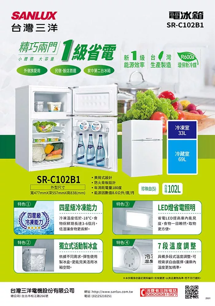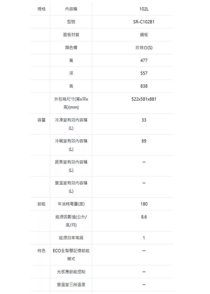 【SANLUX台灣三洋】97公升一級能效單門小冰箱 (SR-V97A)