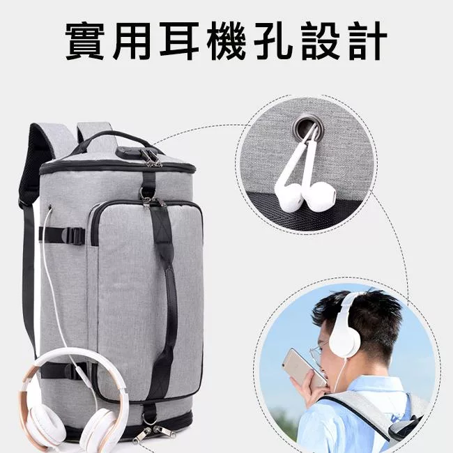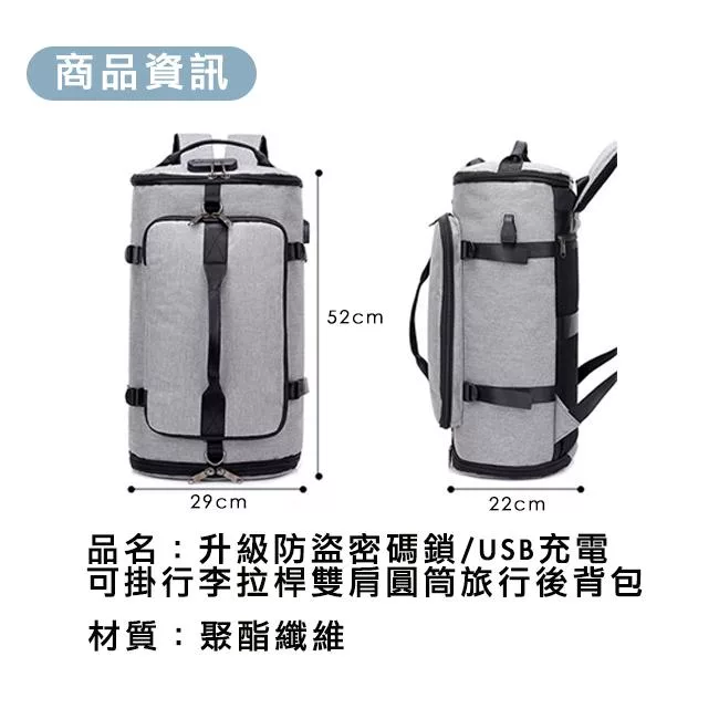 M.E 升級防盜密碼鎖/USB充電可掛行李拉桿雙肩圓筒旅行後背包 灰