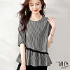 【初色】圓領撞色格紋拼接不對稱荷葉邊短袖T恤上衣-黑色-68474(M-2XL可選) M 黑色