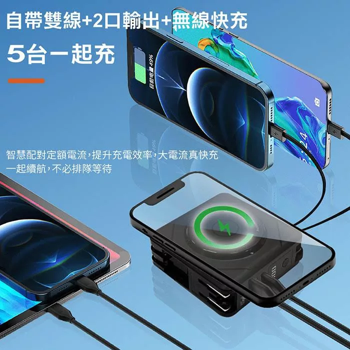 ◎ 2種自帶線+雙口輸出+磁吸無線充電,最高支援五台設備同時充電