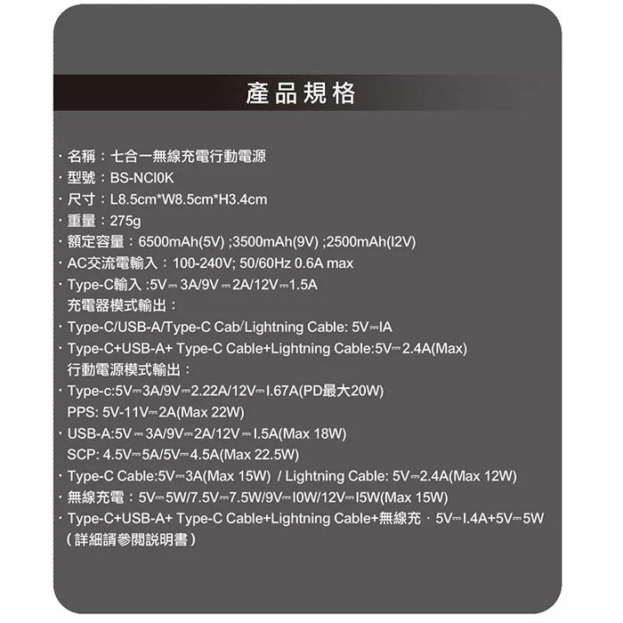 ◎ PD/QC/無線充/電源/自帶線 七合一
