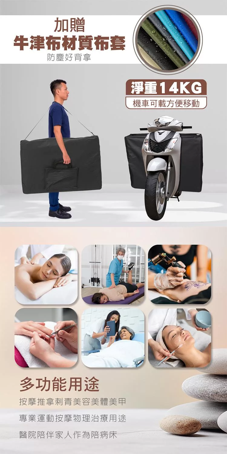 贈送升級版立體頭枕及扶手配件,加贈牛津布材質布套防塵好背拿,淨重僅14KG,機車可載方便移動,