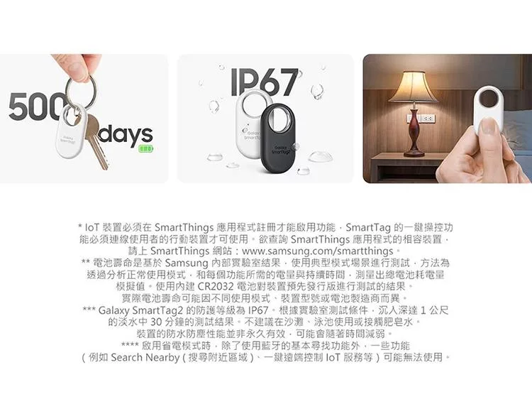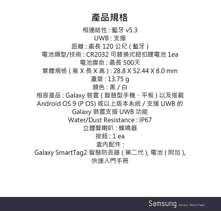 內容物:Galaxy SmartTag2 智慧防丟器 ( 第二代 ), 電池 ( 附加 ), 快速入門手冊