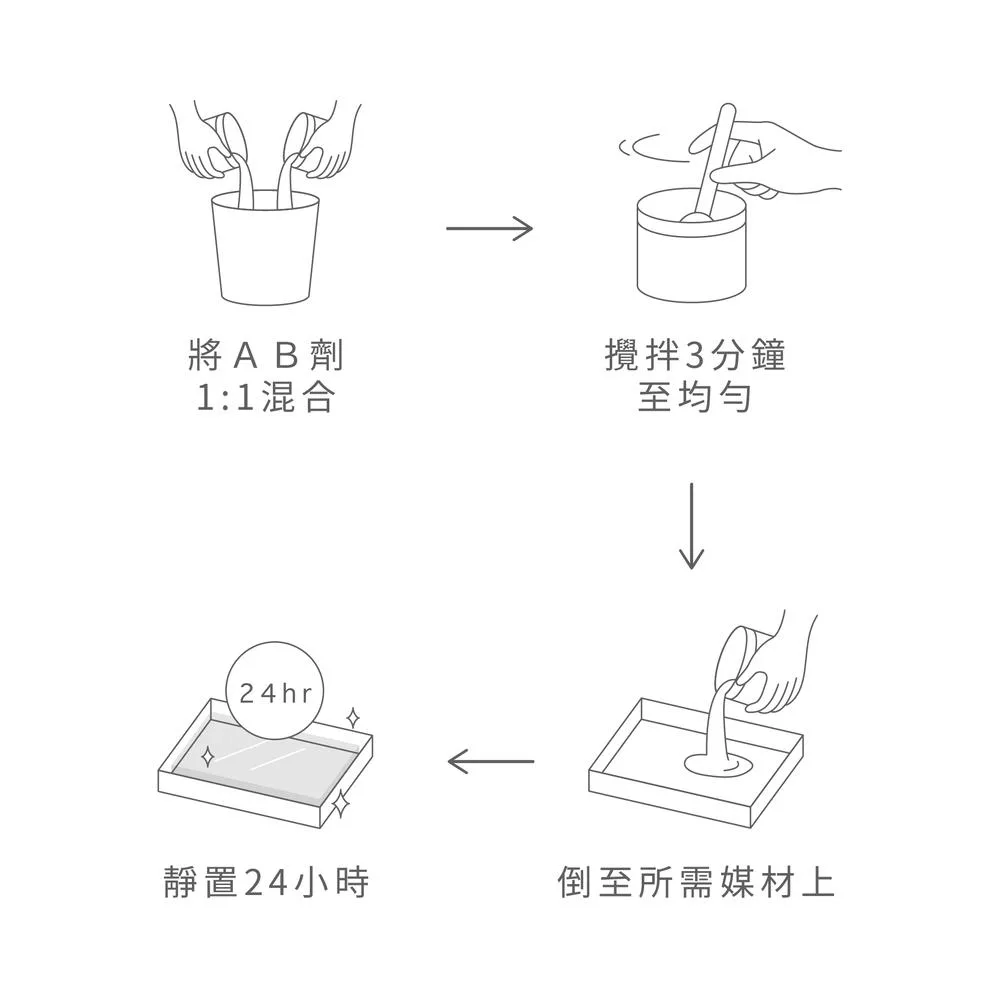 易於使用的比例→1:1,並使用獨家特殊配方,清透不泛黃。