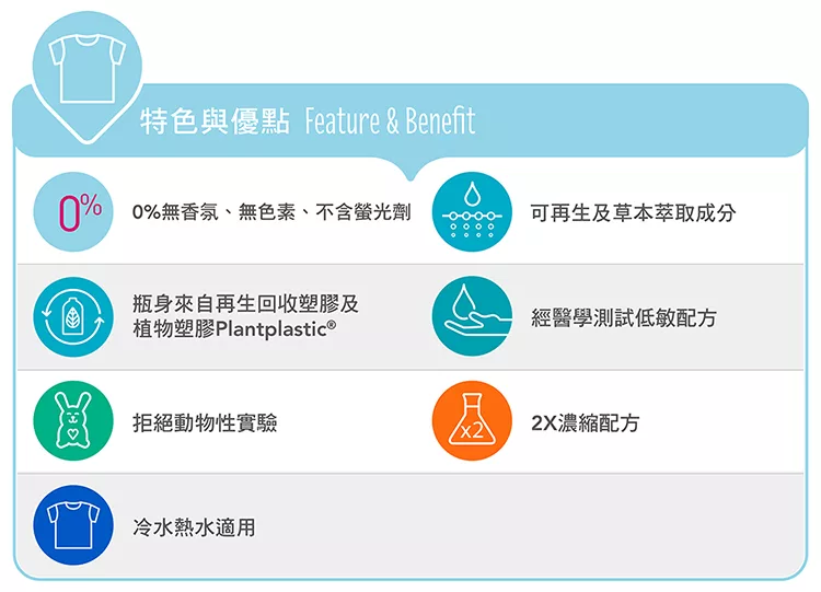 英國過敏協會(Allergy UK)認 證通過,專門為敏感肌膚或過 敏體質,所設計的全新濃縮配方,草本萃取及礦物成分,無添加任何色素、香氛或是酵素,有效清潔,採用植物塑膠製成瓶身,完全可生物分解配方, 善待肌膚及衣物,只對髒污出招,善待自然環境。