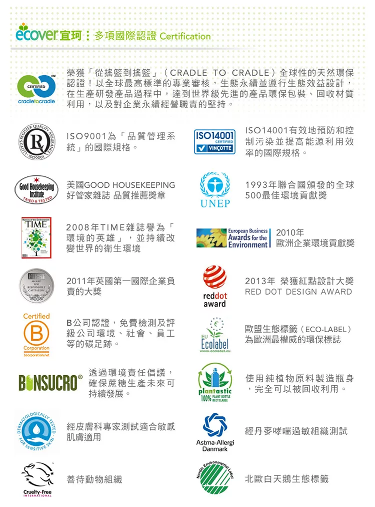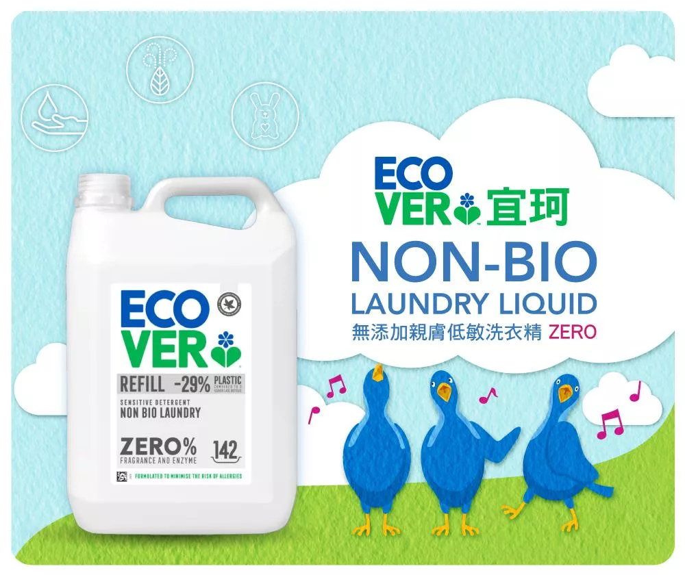 不添加任何香料、香精和色素,特別針對過敏性體質或是敏感性肌膚使用。Ecover產品為自然、安全、健康、無 毒不傷害人體及自然環境,同時通過低敏感測試。