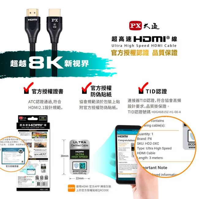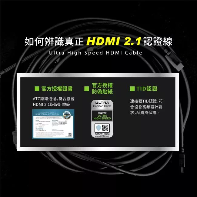 ◎真正HDMI 2.1認證線需具備:(1)官方授權證書(2)官方授權防偽貼紙(3)TID號碼:HDG46B19Z-H1-00-A