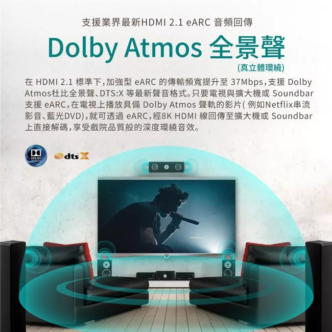 ◎完美環繞音效eARC,支援Dolby Atmos, DTS x環繞聲訊號