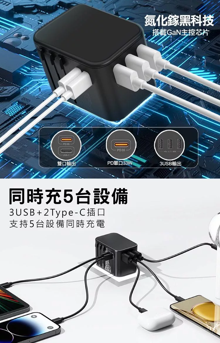 POLYBATT 萬國旅行轉接頭 35W氮化鎵GaN 自帶伸縮線USB充電器 3種國際規格 黑色