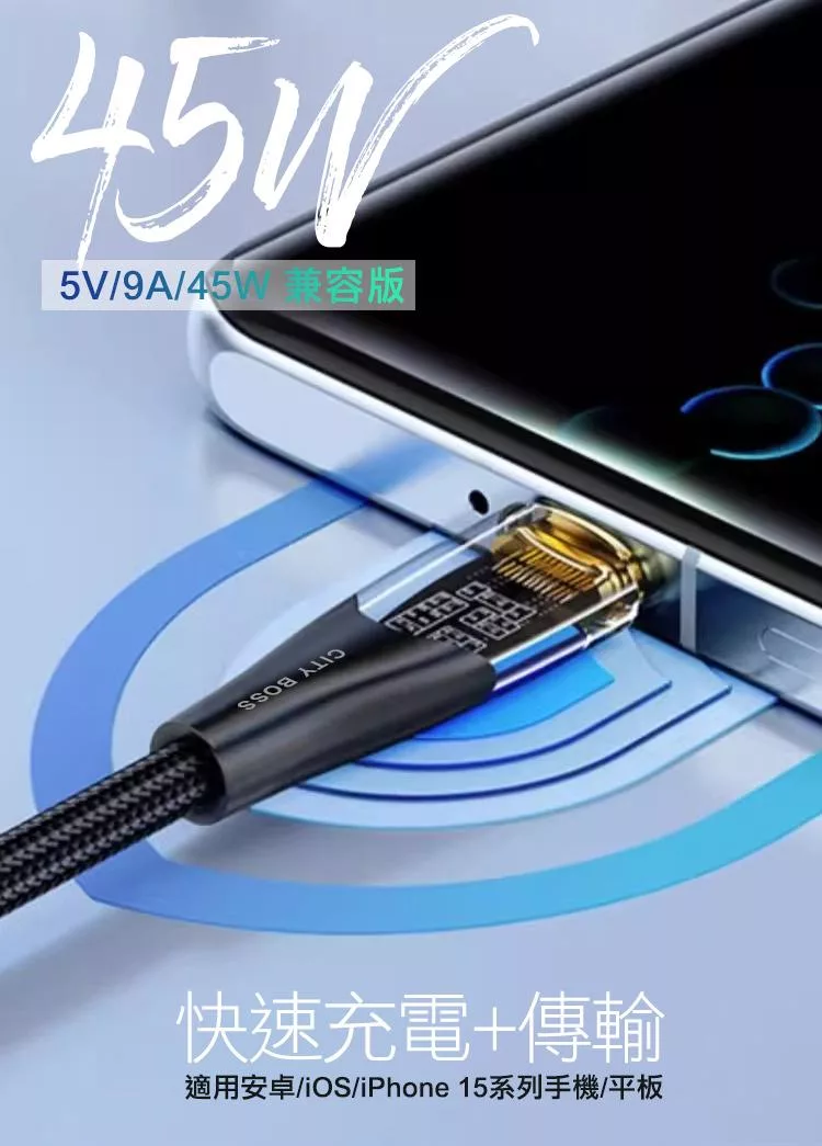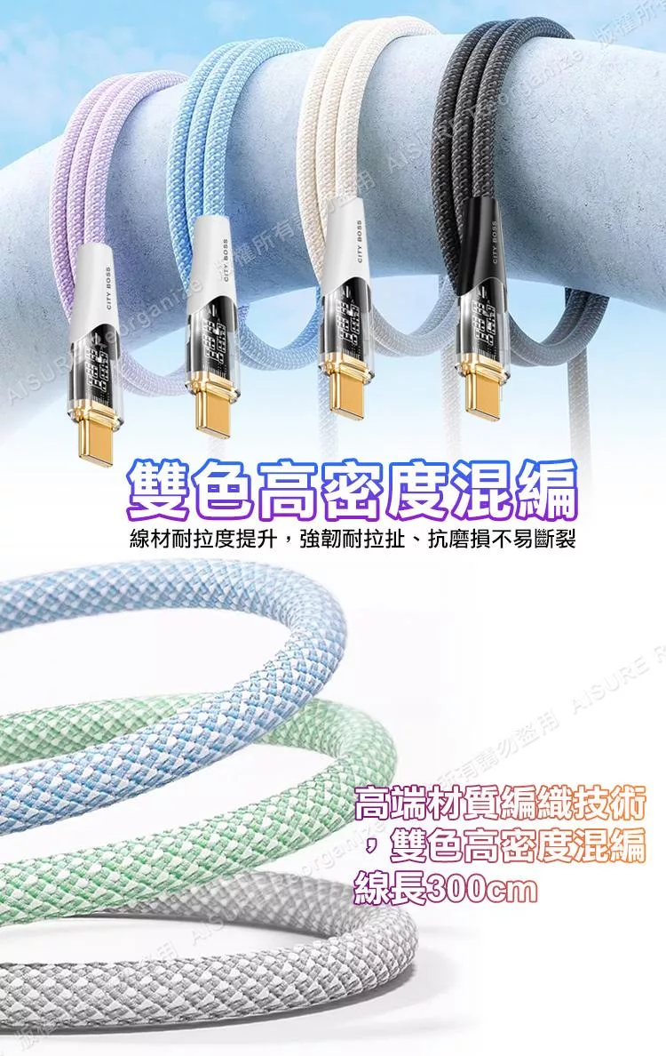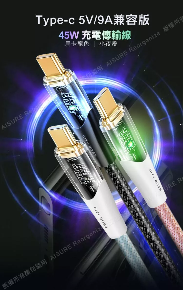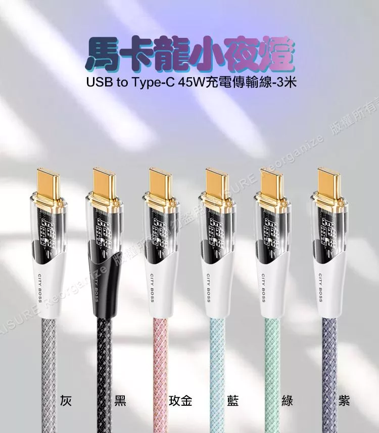 CITY BOSS馬卡龍 USB to Type-C 45W小夜燈充電傳輸線-300cm