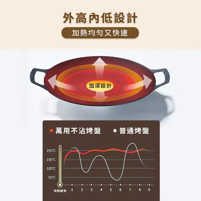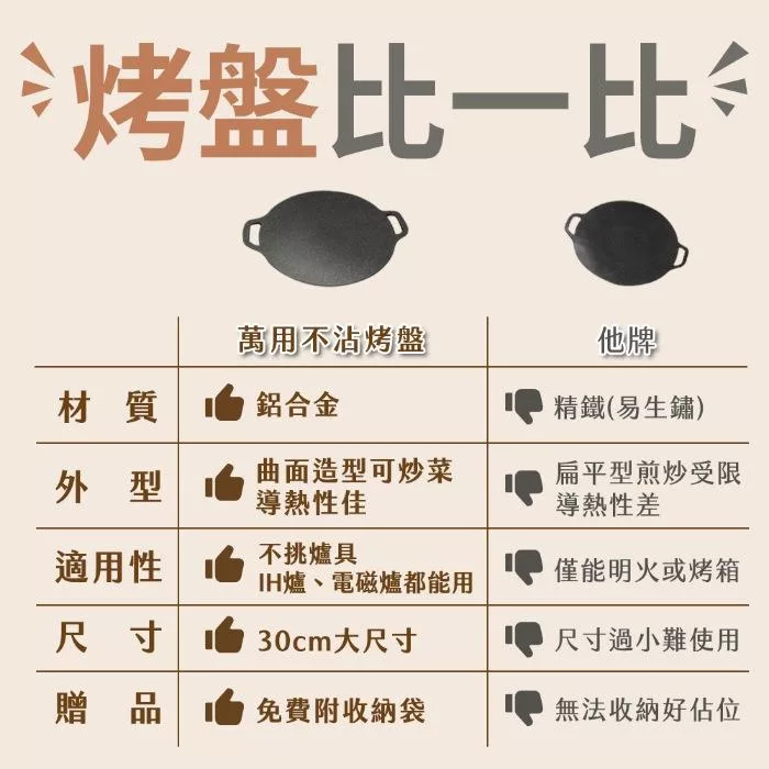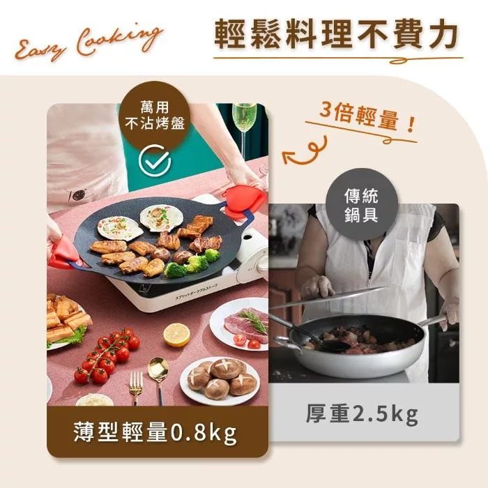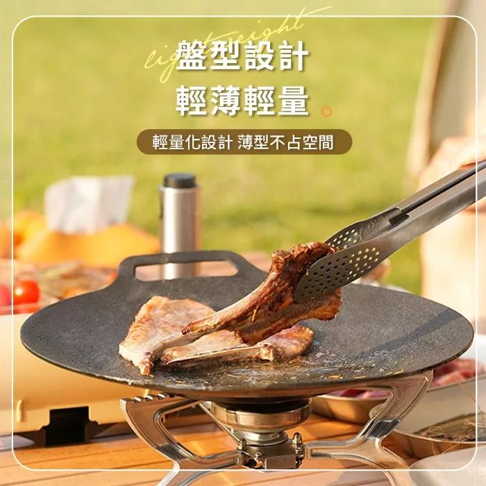 輕量化烤盤,薄型不佔空間! 萬用可烤、煎、炒,居家、露營、野餐攜帶方便! 升級麥飯石內外不沾塗層,清洗不費力,雙耳把手,露營野炊也能吊掛晾乾!