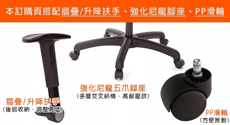 本訂購頁規格:摺疊升降扶手、尼龍腳座、PP滑輪
