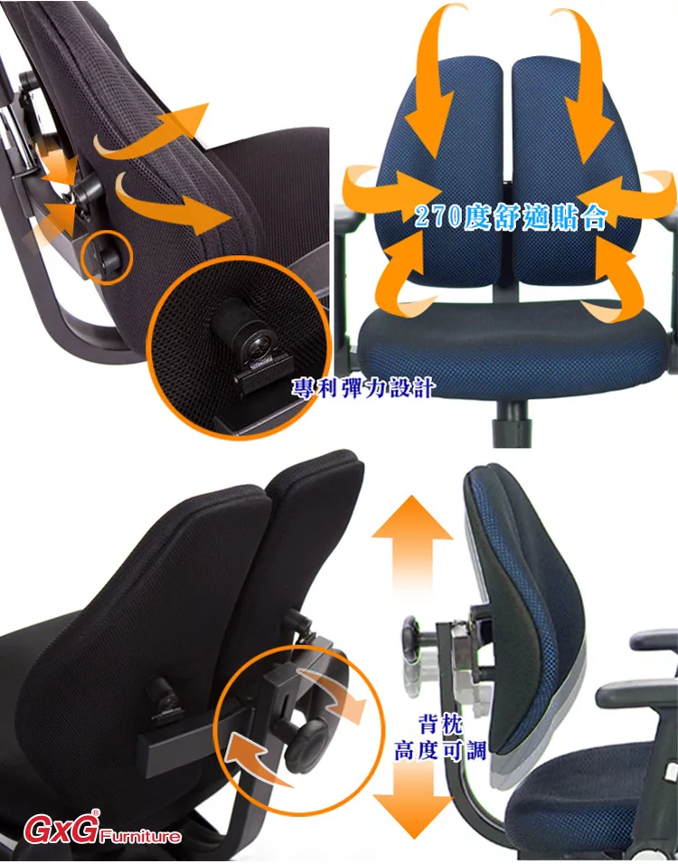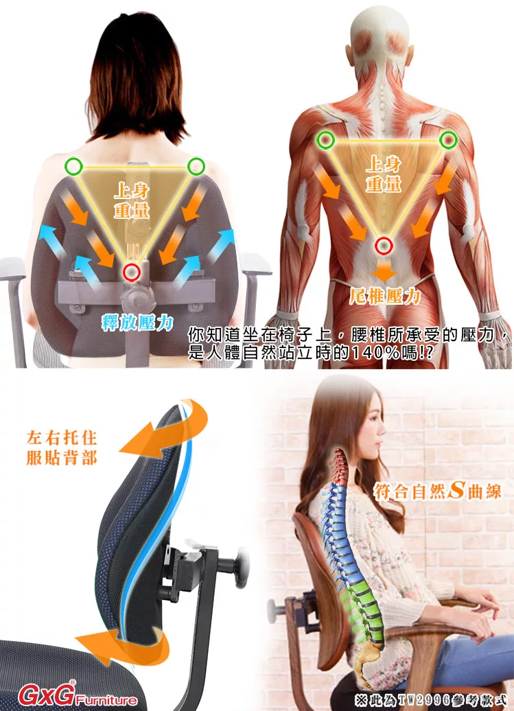 一般的電腦椅,實際上『椅背』大都不能支撐人體腰椎,緣自於人體本身的構造,人體的肩胛骨兩旁延伸至肩膀,其雙肩的壓力,會集中到腰椎中心處形成一個『倒三角的點』,如同一個箭頭向下將壓力壓迫到腰椎,無法讓脊椎肌肉正常釋放重力。 GXG Furniture開發出新式『智慧雙背椅』,提倡健康座、舒適生活,當您坐在一般椅子上,腰椎基本所承受的壓力,是人體自然站立時的140%,而使用『雙背智慧椅』,如同多了一雙手,完整托住您的背部,明顯比一般椅子減輕百分之五十的腰椎壓力,讓腰椎壓力降至75%,改善您長久以來的困擾怎麼坐,都痠痛的問題,能讓您舒適度明顯提升
