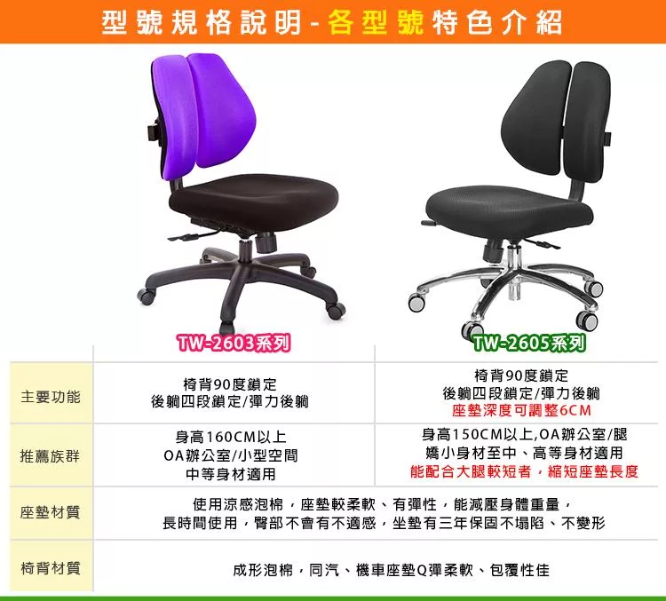 TW-2605低背款雙背椅,適合身高160~185CM使用者,椅背採用人體工學設計,造型看似烏魚子、或是像兩個人體肺的型狀,這樣的設計,是讓我們在乘坐後靠時,能更貼合我們背部,緩和脊椎的重力,降低尾椎壓力,給長時間工作者一張,聰明、會改善坐姿習慣的智慧椅。