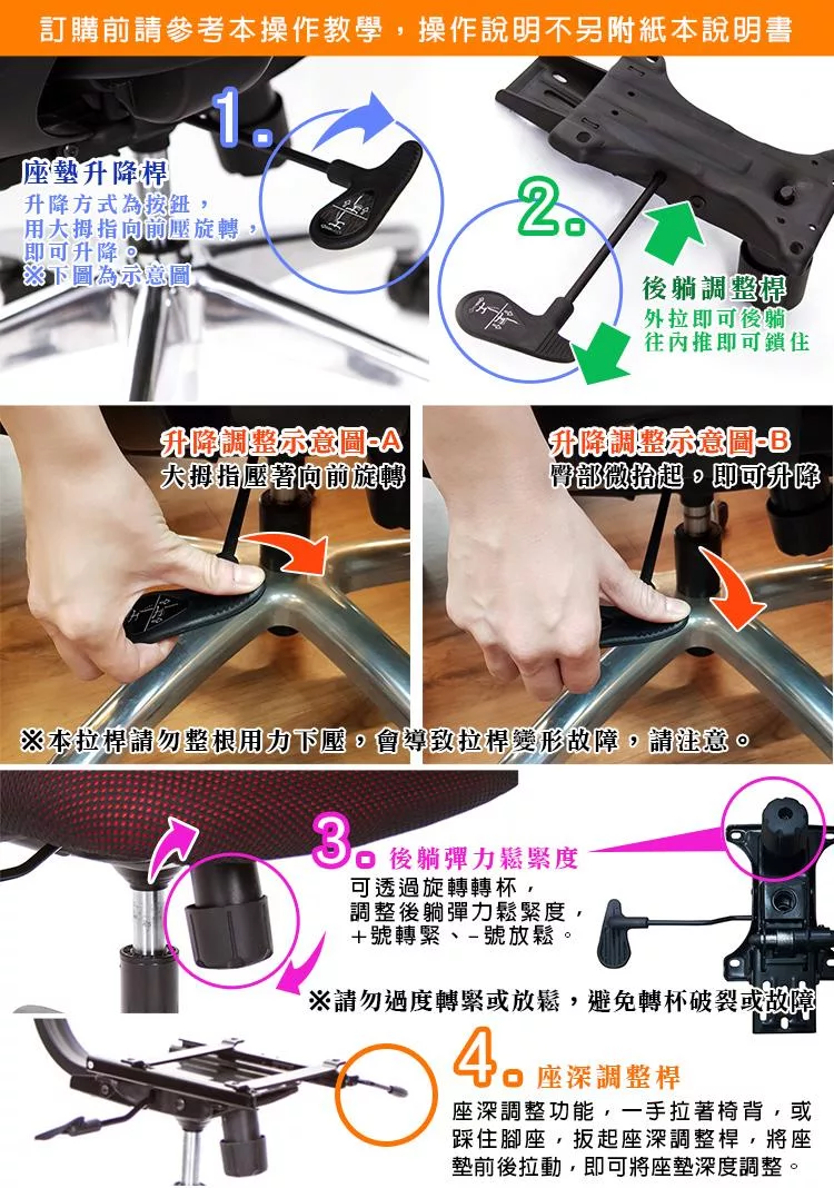 7.使用座椅前,需注意使否有安裝、鎖定穩固,請勿站在椅子上、跳座上椅子、蹬腳、雙腳離地,腳放桌上、盤腿在座椅上,不當使用容易發生危險,或座椅結構損壞。