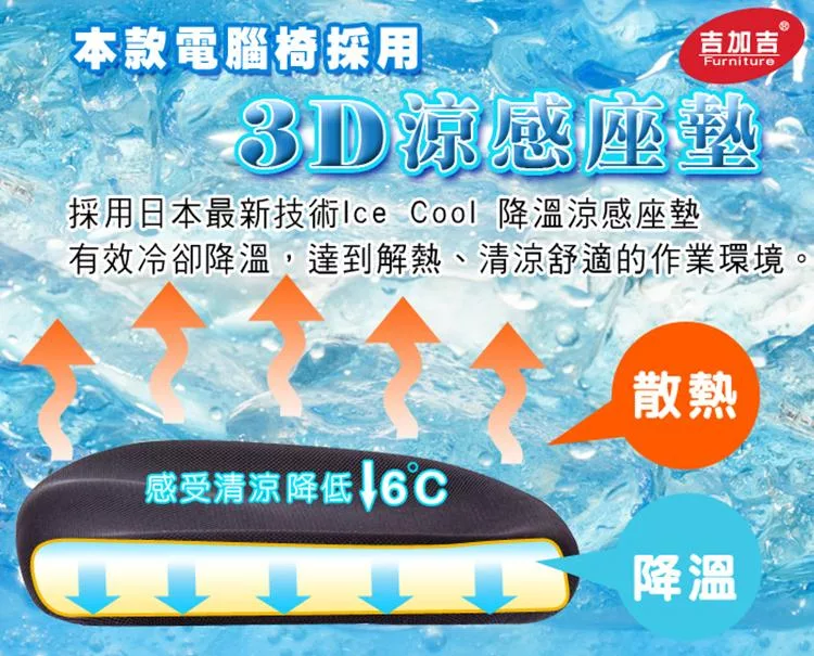採用日本最新技術Ice Cool 涼感發泡製成的泡棉,有效冷卻降溫,達到解熱、清涼的舒適作業環境,有著泡棉Q軟彈性,以及網布的透氣特性。
