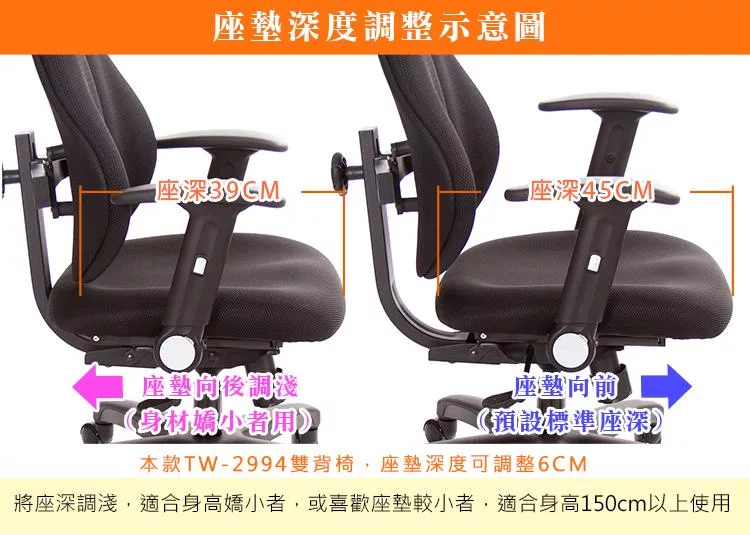 本款TW-2605坐墊可調整座墊深度,能將座墊向後縮短座深6cm間距,基本實座深度45CM,可縮淺至39CM,適合身高150~185CM以 下,
