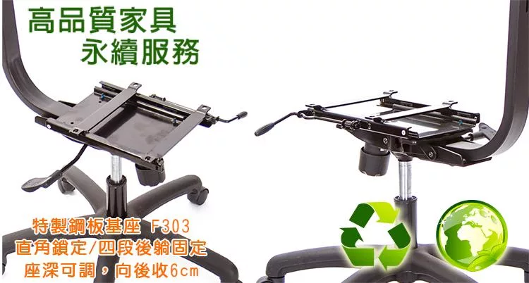 本款座墊底盤使用,F303懸吊鋼板基座,可四段後躺固定,依自己喜好故定角度,或不固定隨時可彈力後躺雙功能;懸臂機構在後躺時,座墊會同步傾斜,重心平穩,防止翻倒。