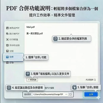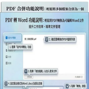 用戶好處:輕鬆將不同類型的檔案增合併為一個PDF檔,方便管理、共享、搜尋或傳送。