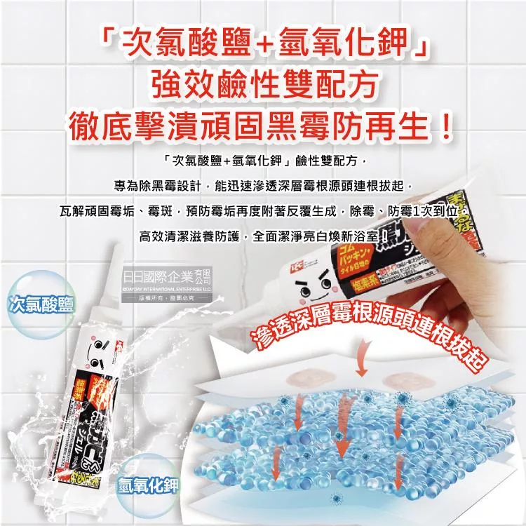 ●「次氯酸鹽+氫氧化鉀」鹼性配方,徹底瓦解黑霉防再生,約30分鐘見效!