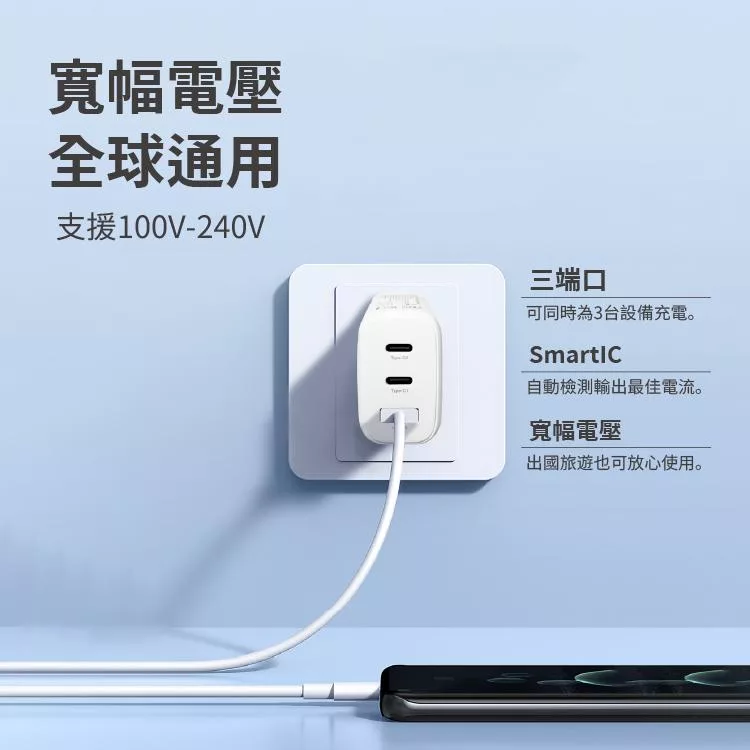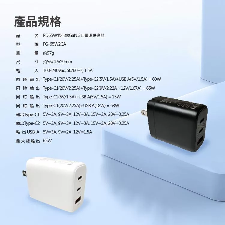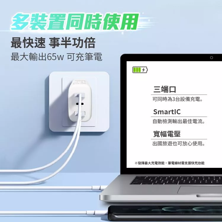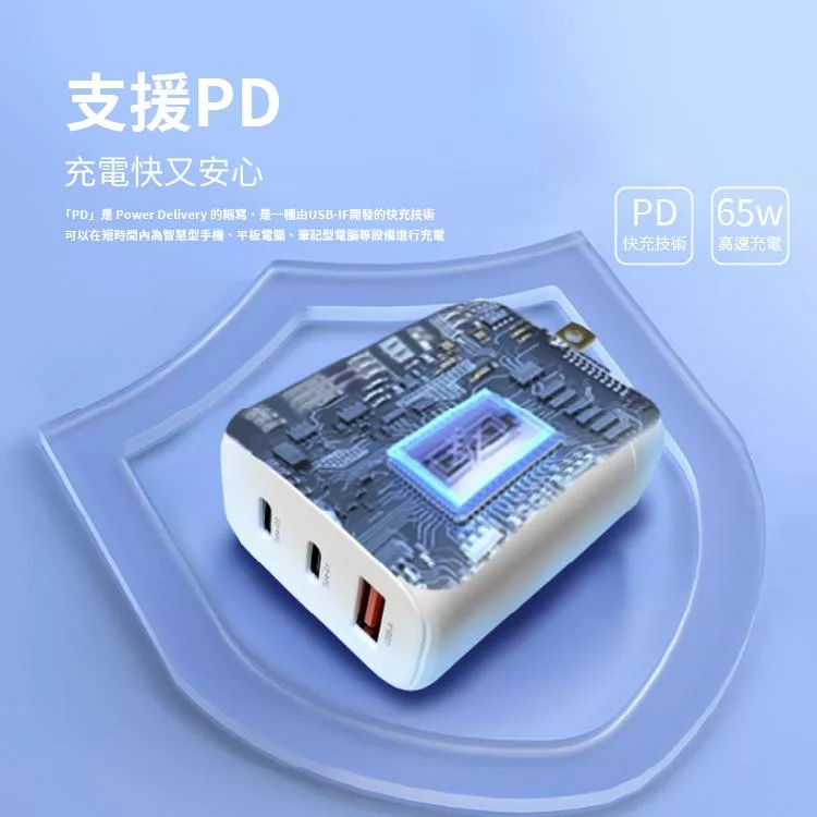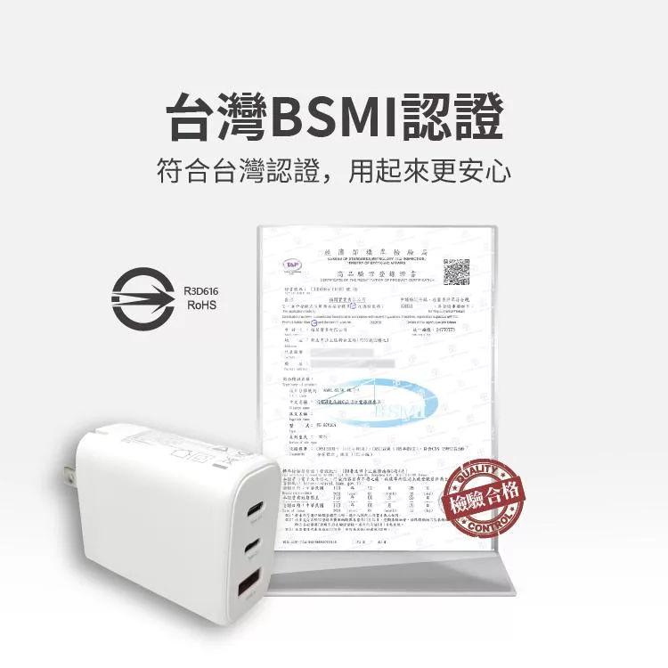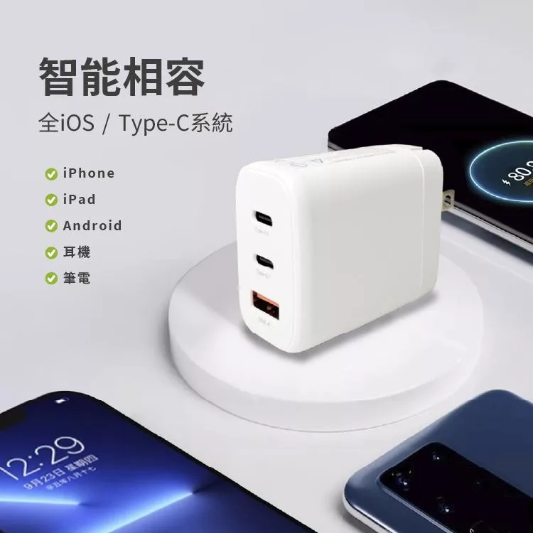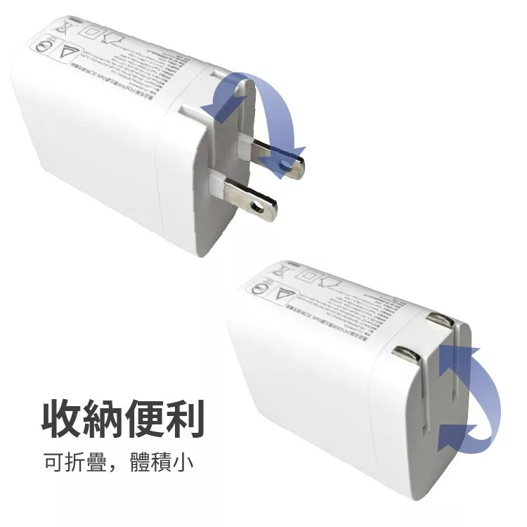 BSMI認證核可 讓您充得安心 GaN氮化鎵晶片,提高充電效率,廣泛兼容性,滿足多設備需求,可摺疊式插頭,超方便!