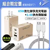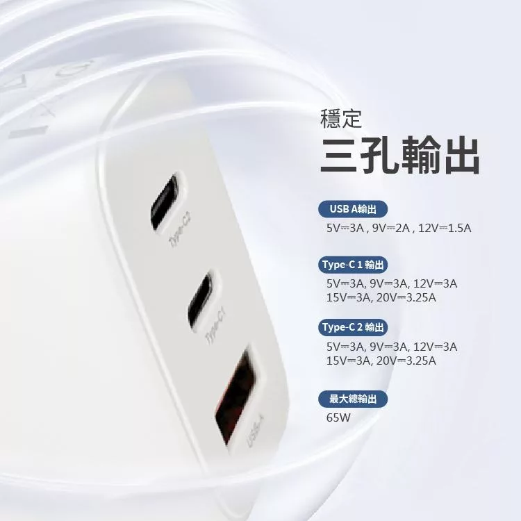 WELLY 65W氮化鎵GaN 三孔極速充電器+USB to Type-C 耐拉編織充電線(100CM) 白色+線