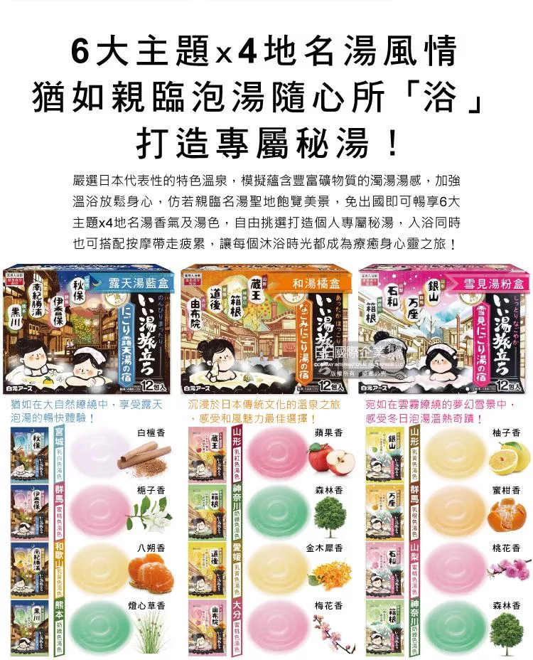●6大主題x4地名湯風情,猶如親臨溫泉勝地,放鬆沐浴療癒身心靈!