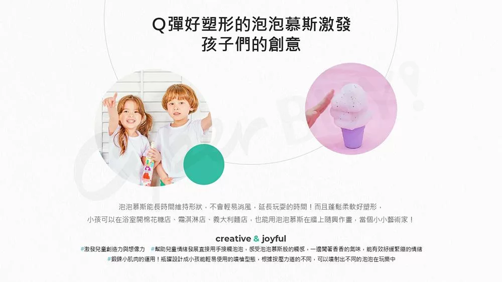 ❤激發創造力及想像力:用棉花糖般的柔軟泡泡,做出各種模樣的作品,綿密質地的豐富泡泡能夠輕易的塑形。