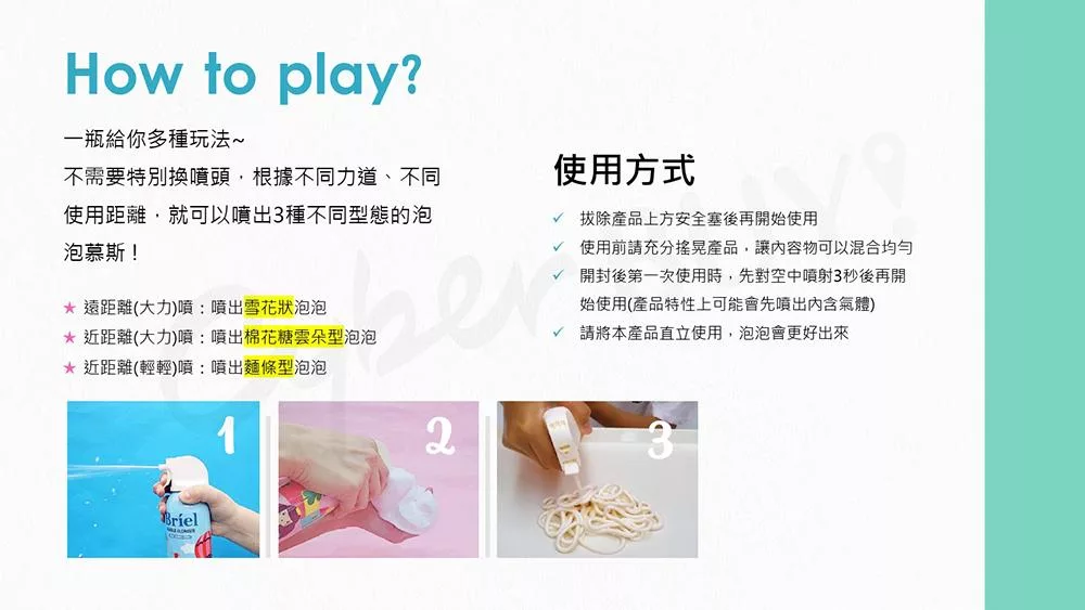 ❤小肌肉發展:幼兒也能輕易使用的噴槍型態,根據按壓力道的不同,可以噴射出不同型態的泡泡。用柔軟細緻的泡泡做出各種造型,在玩樂中鍛鍊小肌肉的運用