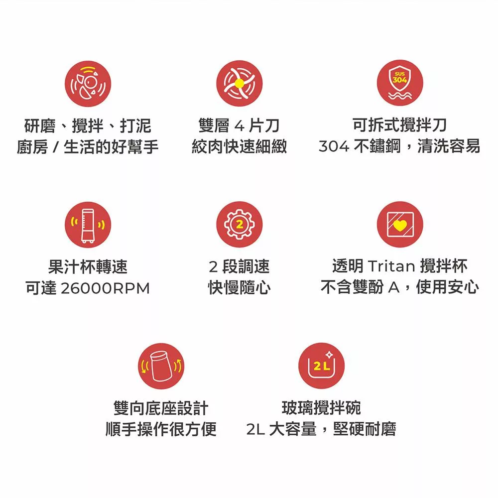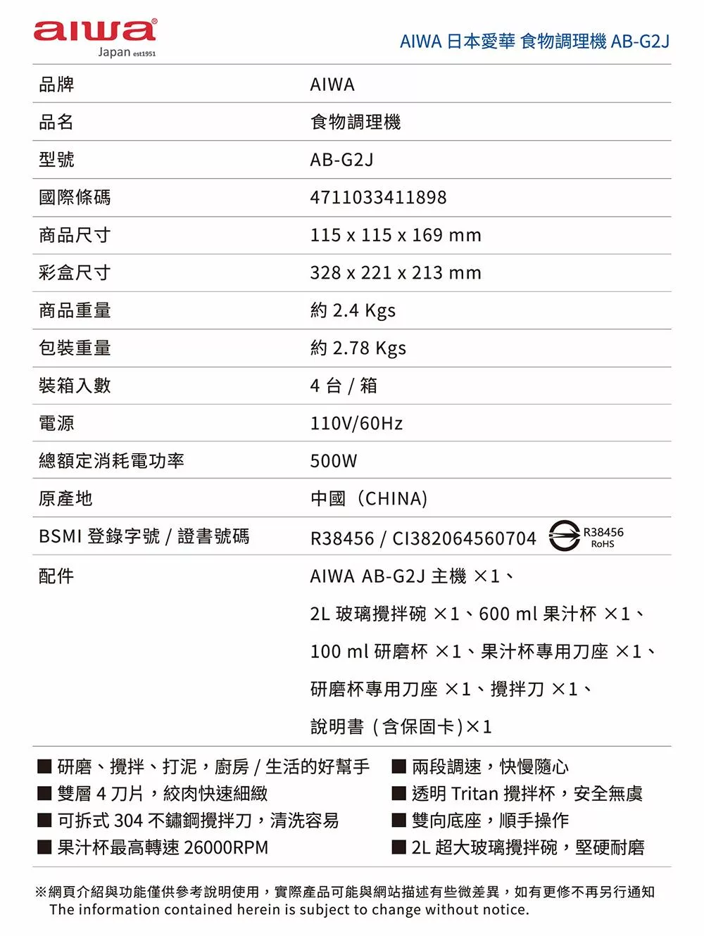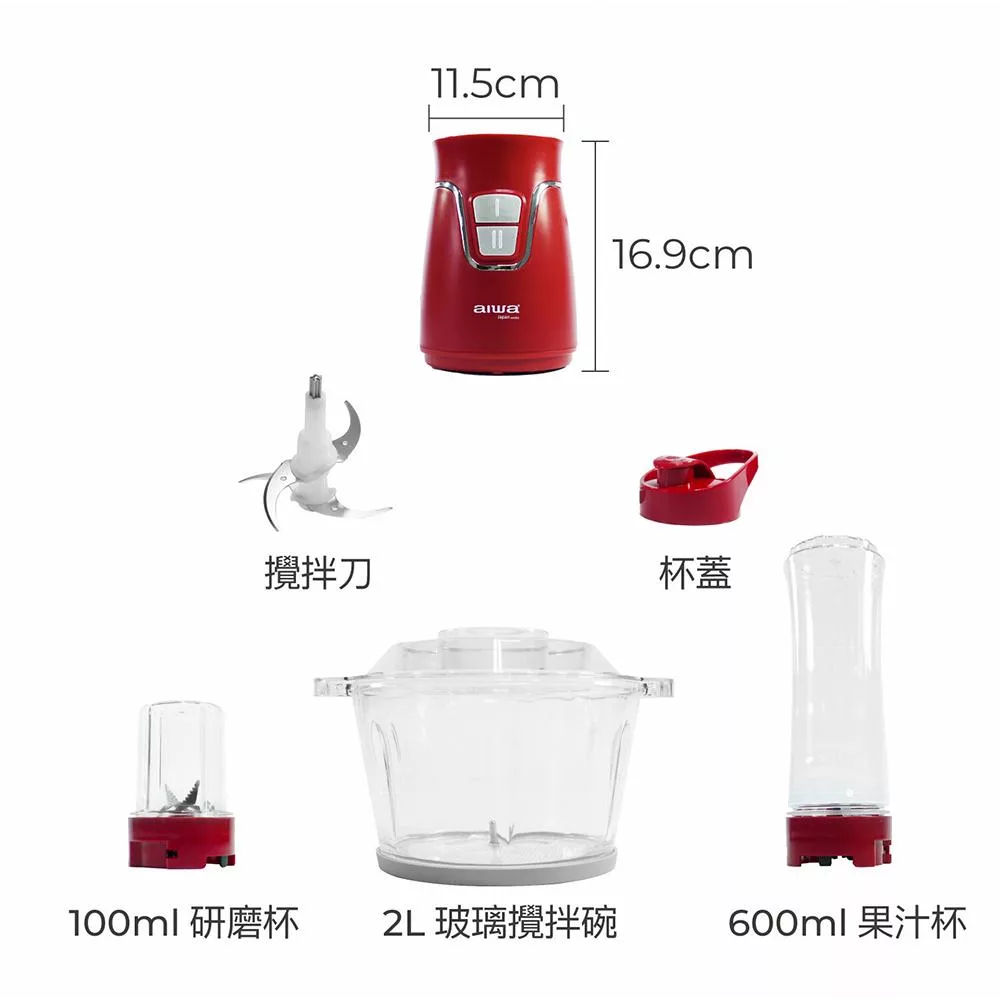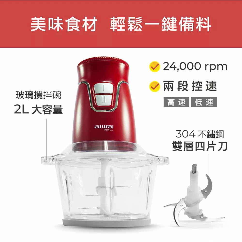AIWA愛華 304不鏽鋼4刀頭食物調理機2L(附果汁杯+研磨杯) AB-G2J