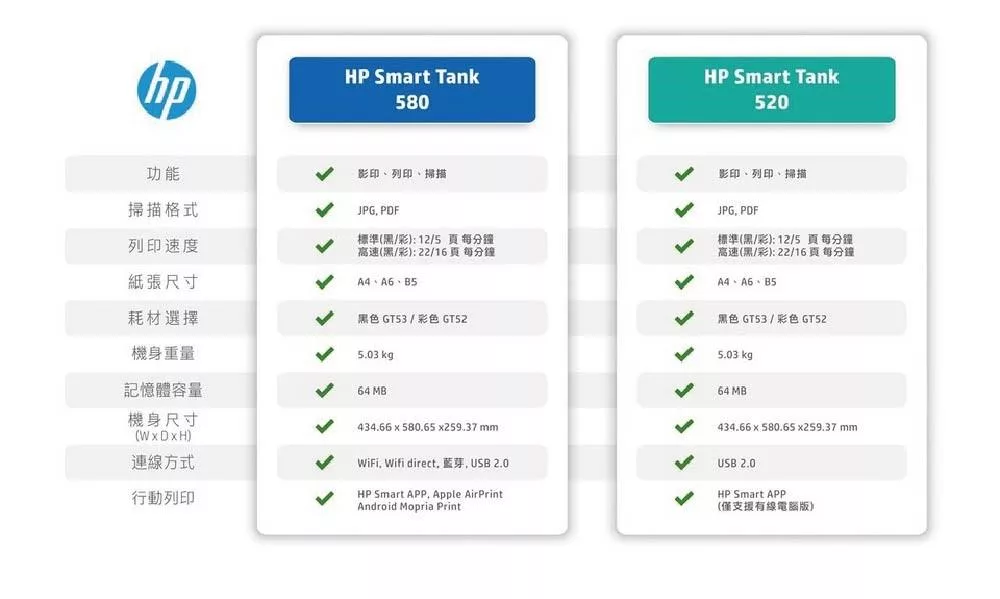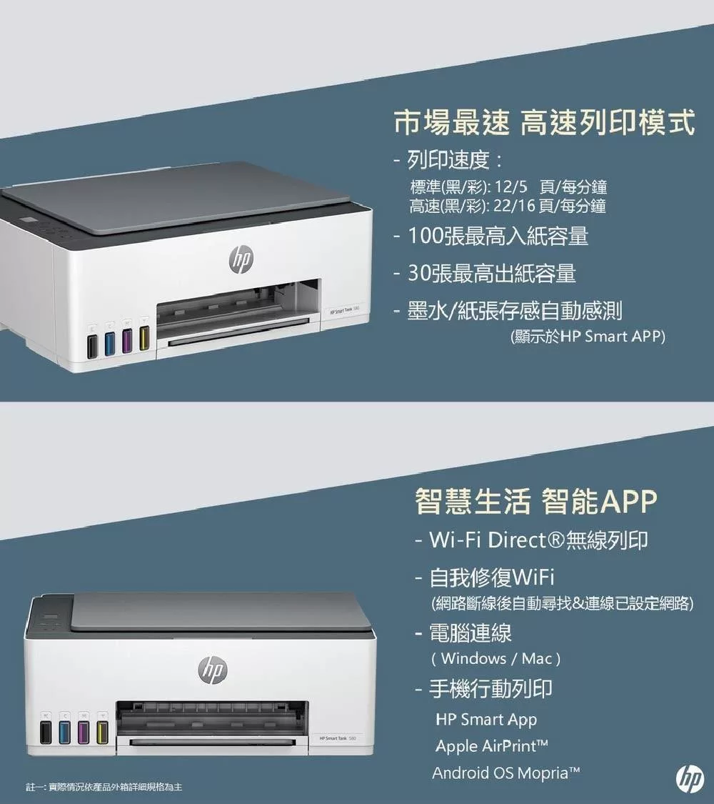 - 無線列印: 支援 HP Smart App, Apple AirPrint, Android OS Mopria。在手機上使用 HP Smart 應用程式即可列印及掃描。