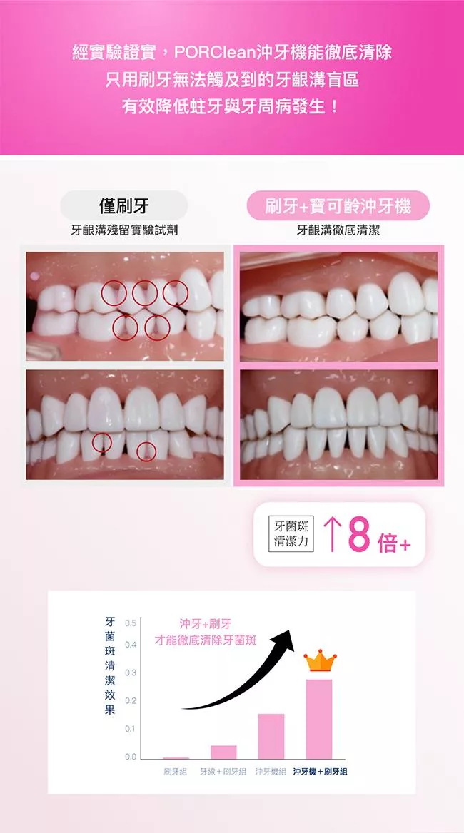 ◆實驗證實,刷牙搭配寶可齡沖牙機,牙菌斑清潔力提升8倍以上。