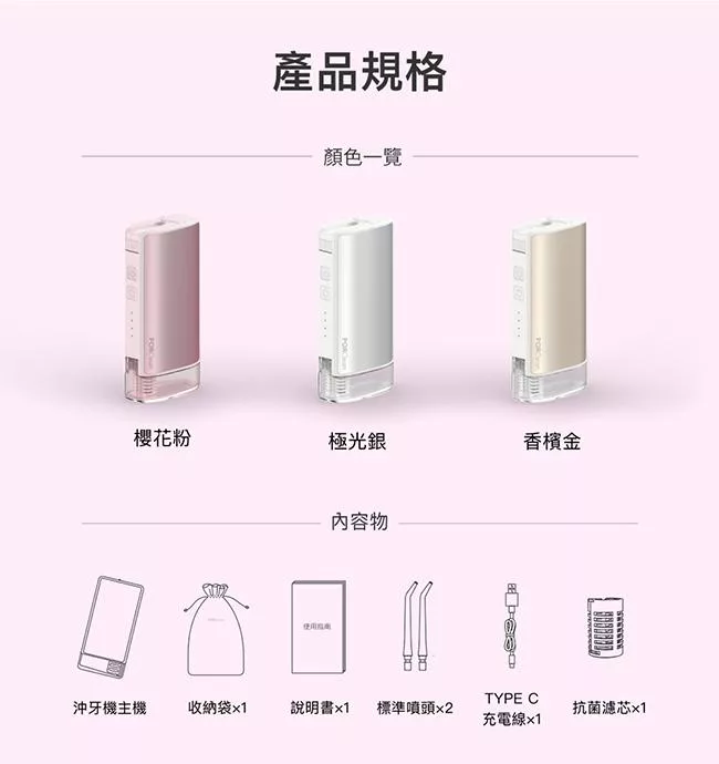 ◆配件:標準噴頭x2、抗菌濾芯x1、TYPE-C充電線x1、收納袋x1、說明書x1
