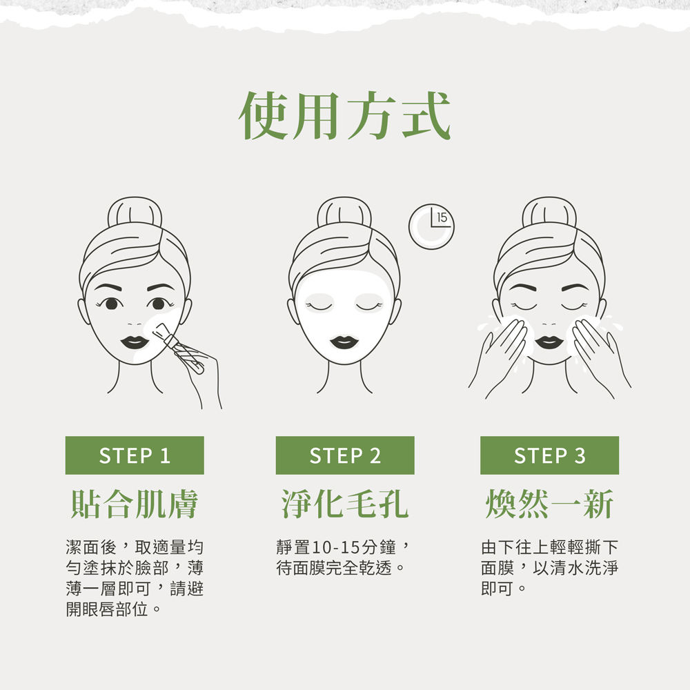 使用方式:潔面後,均勻塗抹於臉部,避開眼唇等敏感部位,等待15-20分鐘面膜乾透後,輕輕撕下面膜後,以清水洗淨即可。
