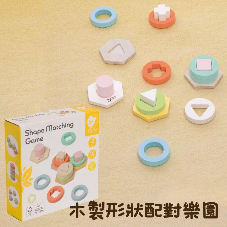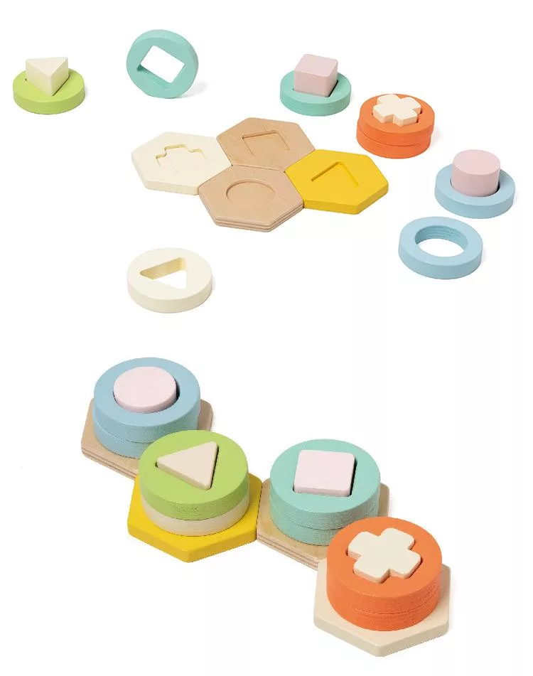 這款玩具由16個色彩鮮艷的木製配件組成,包括圓形、三角形、正方形和十字形等多種形狀。