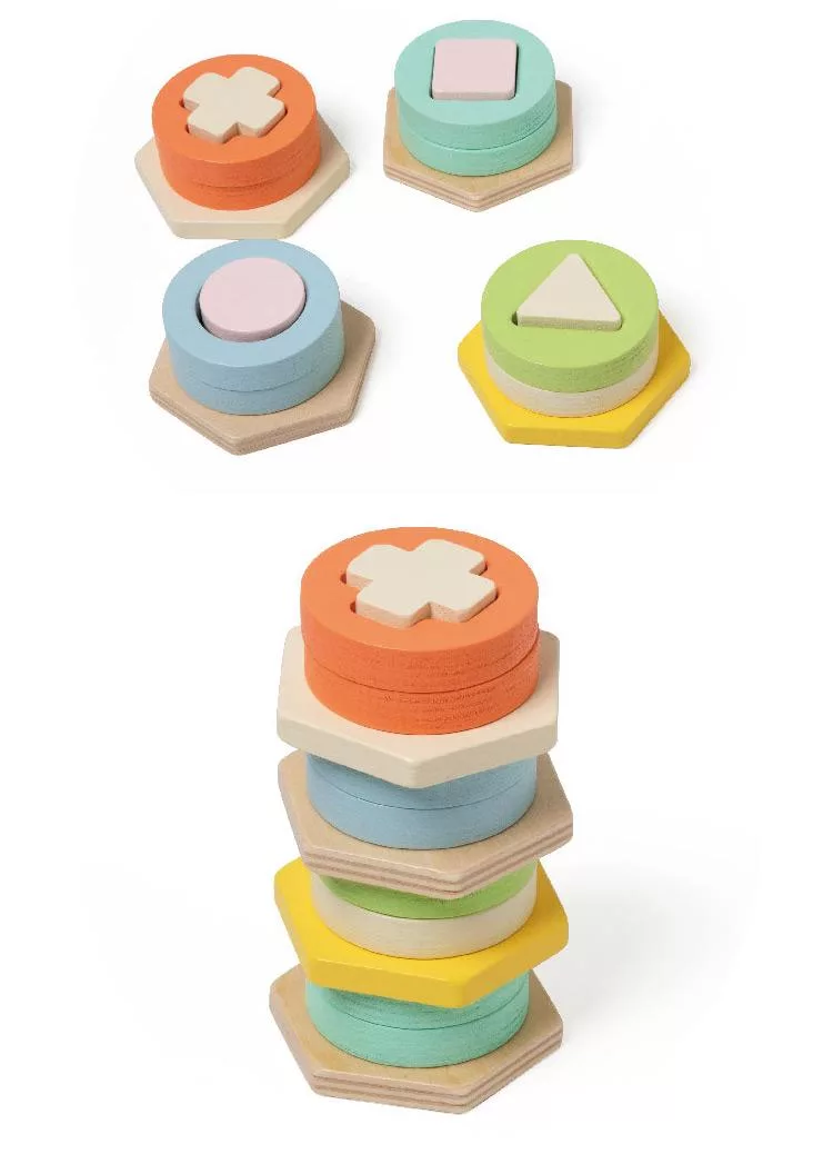 孩子們需要將這些形狀放置在對應的柱子上,從而學習識別不同的形狀和顏色。