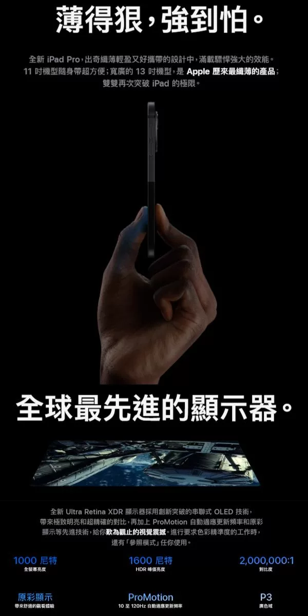 ◎螢幕:13吋Ultra Retina XDR顯示器、串聯式OLED技術、2,752 x 2,064 pixels解析度、ProMotion技術,支援10Hz至120Hz、自動適應更新頻率、廣色域(P3)、原彩顯示、防指印疏油外膜、全平面貼合、抗反射鍍膜、SDR亮度:1000尼特最大亮度;XDR亮度:1000尼特最大亮度(全螢幕),1600尼特峰值亮度(僅限HDR內容)、2,000,000:1對比度、支援Apple Pencil Pro、支援Apple Pencil(USB‑C)、Apple Pencil懸浮功能、264 ppi