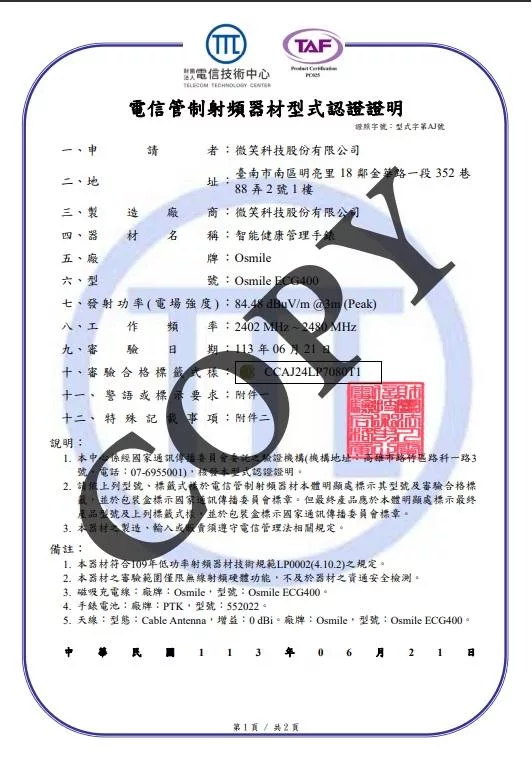Osmile ECG400 並非醫療裝置,並非用於診斷疾病狀況。以上健康相關數據測量結果僅供參考,請勿根據 Osmile ECG400 的測量結果調整藥物。請按醫師的規定服藥,只有醫生才有資格診斷及治療疾病。所有數據僅供參考,提醒使用者平時應多加運動並注意身體健康,不應做為醫療診斷之用途,此產品並非醫療器材。
