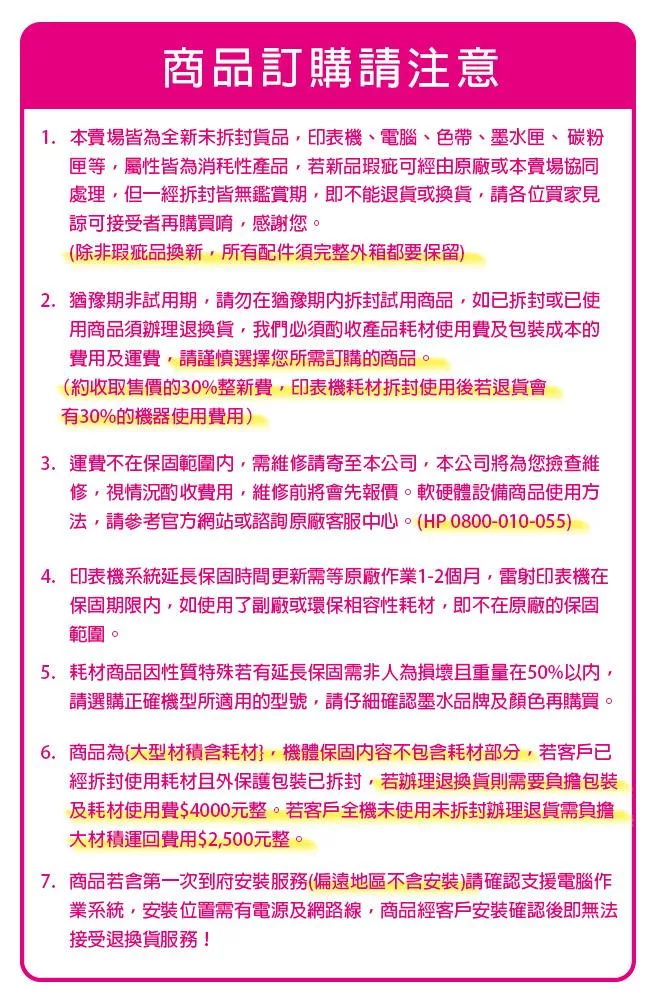 當您於此頁面下單表示您了解並同意下述規範,請注意!