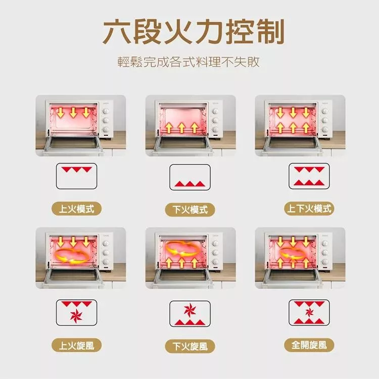 六種火力選擇(上火、下火、上下火、上火旋風、下火旋風、全開旋風)