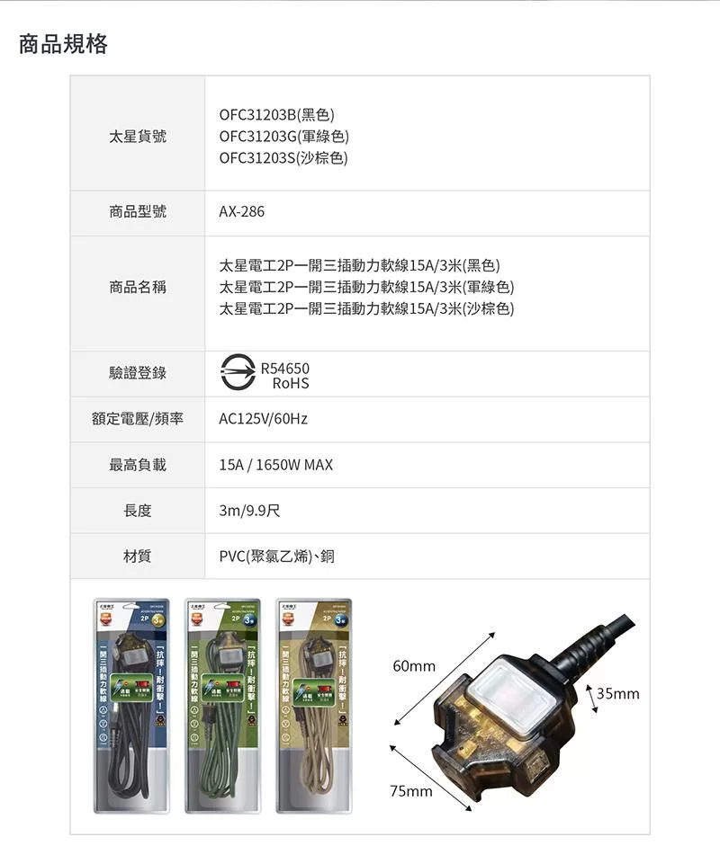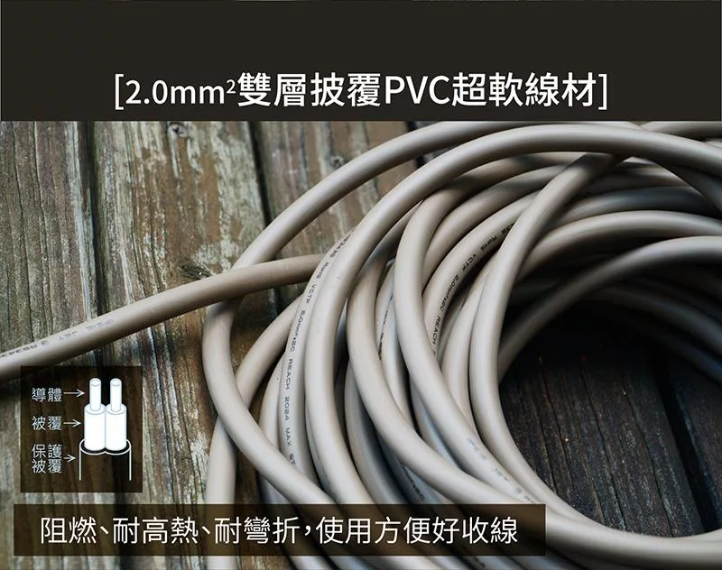 4..2.0mm2雙層披覆PVC超軟線材,阻燃、耐高熱、耐彎折,使用安心。