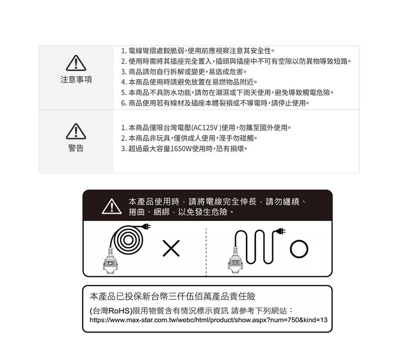 1. 本商品僅限台灣電壓(AC125V )使用,勿攜至國外使用。