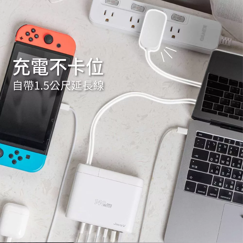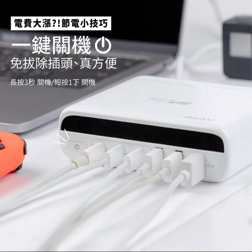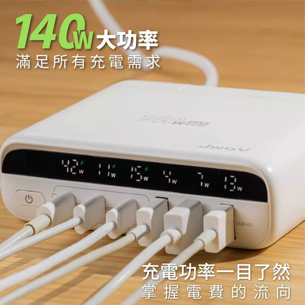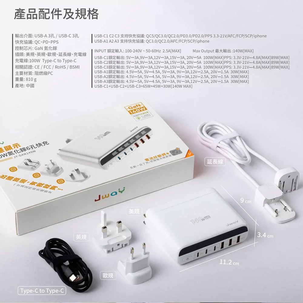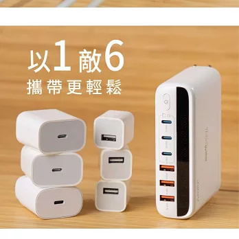 JWAY 智慧顯示140w氮化鎵6孔快充 (JY-GAN140W/旅行充電/萬國充電/手機平板筆電PD/QC快充) 白色